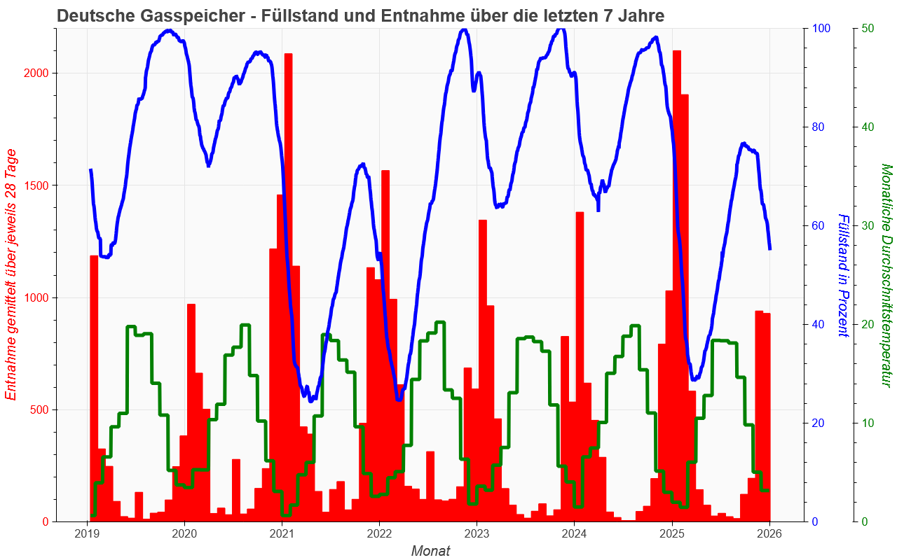Der aktuelle Füllstand beträgt: 55%. Je kälter es wird, desto schneller fällt das verbleibende Restvolumen. Denn so schnell, wie das Gas verbraucht wird, kann es nicht nachgeliefert werden. Das war schon vor dem russischen Gasboykott so. Genau dafür haben wir ja die Speicher in den Kavernen und ehemaligen Bergwerken.