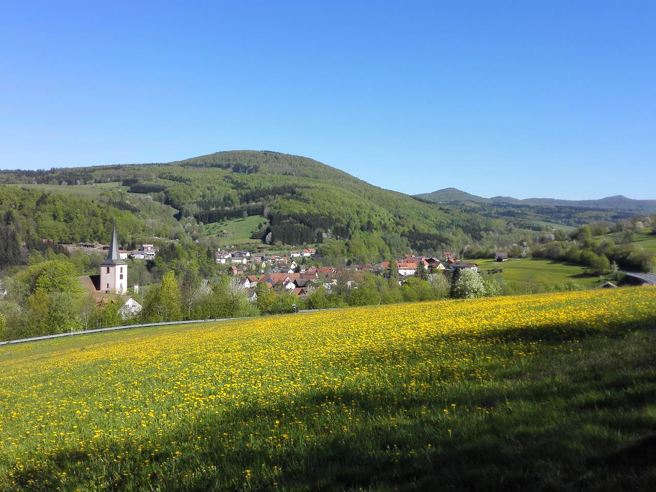 Der Himmel blau, die Buchenwälder frisch ergrünt, die saftigen Wiesen voll mit gelbem Löwenzahn und die Blicke von den Bergen in die Mittelgebirgslandschaft weit und einladend. Nicht umsonst sprechen die Einheimischen vom „Land der offenen Fernen“.
