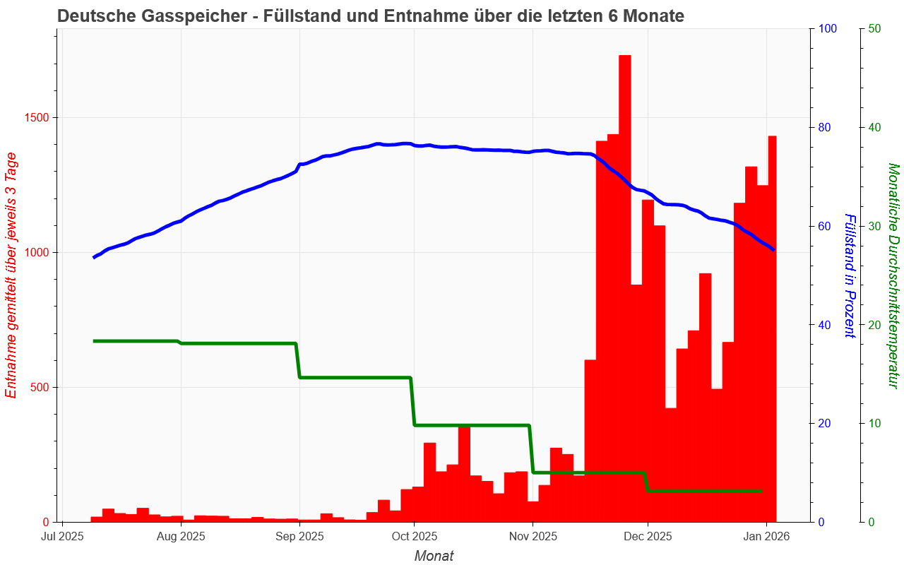 Der aktuelle Füllstand beträgt: 55%. Je kälter es wird, desto schneller fällt das verbleibende Restvolumen. Denn so schnell, wie das Gas verbraucht wird, kann es nicht nachgeliefert werden. Das war schon vor dem russischen Gasboykott so. Genau dafür haben wir ja die Speicher in den Kavernen und ehemaligen Bergwerken.