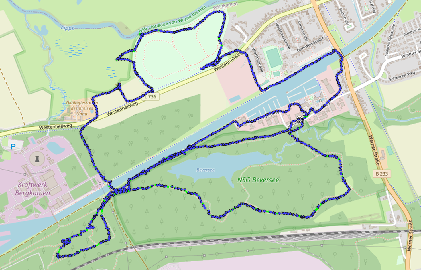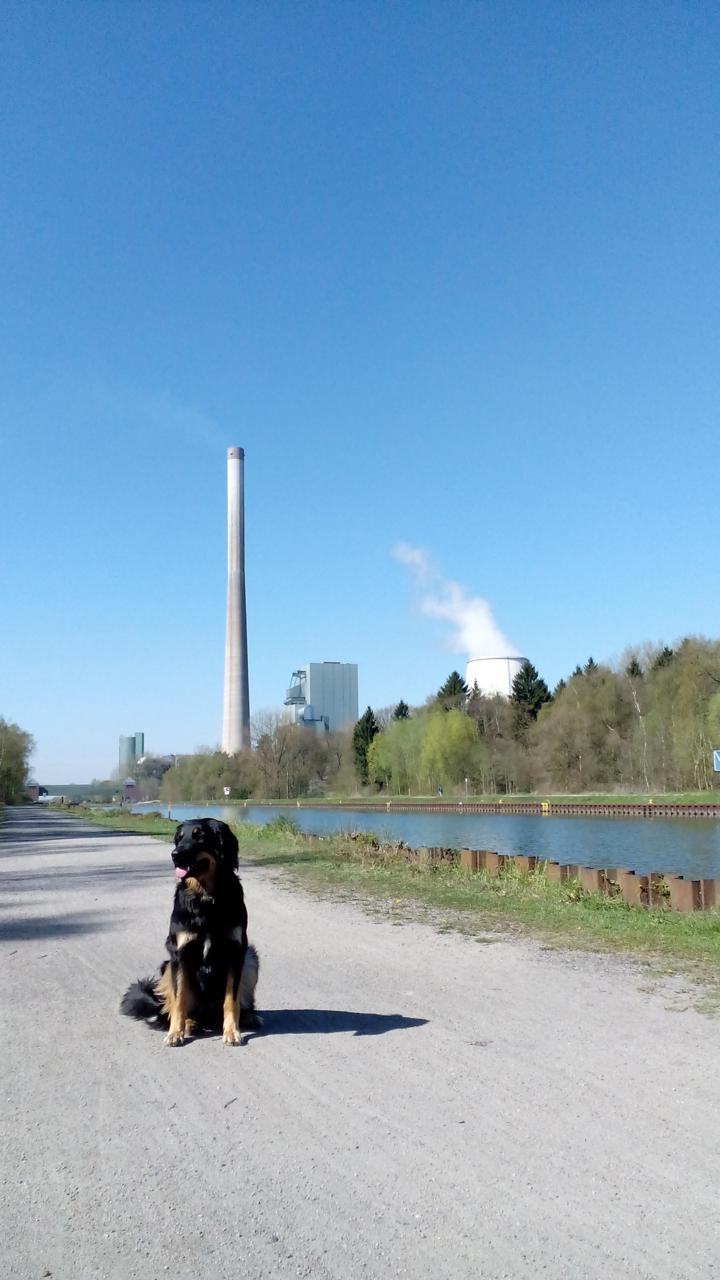 Nicht weit entfernt erheben sich die hohen Türme des Bergkamener Kraftwerks, daneben auf der anderen Seite des Kanals eine renaturierte Abraumhalde.