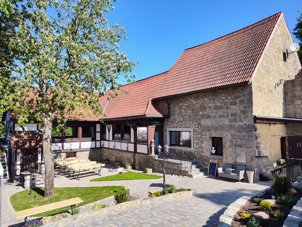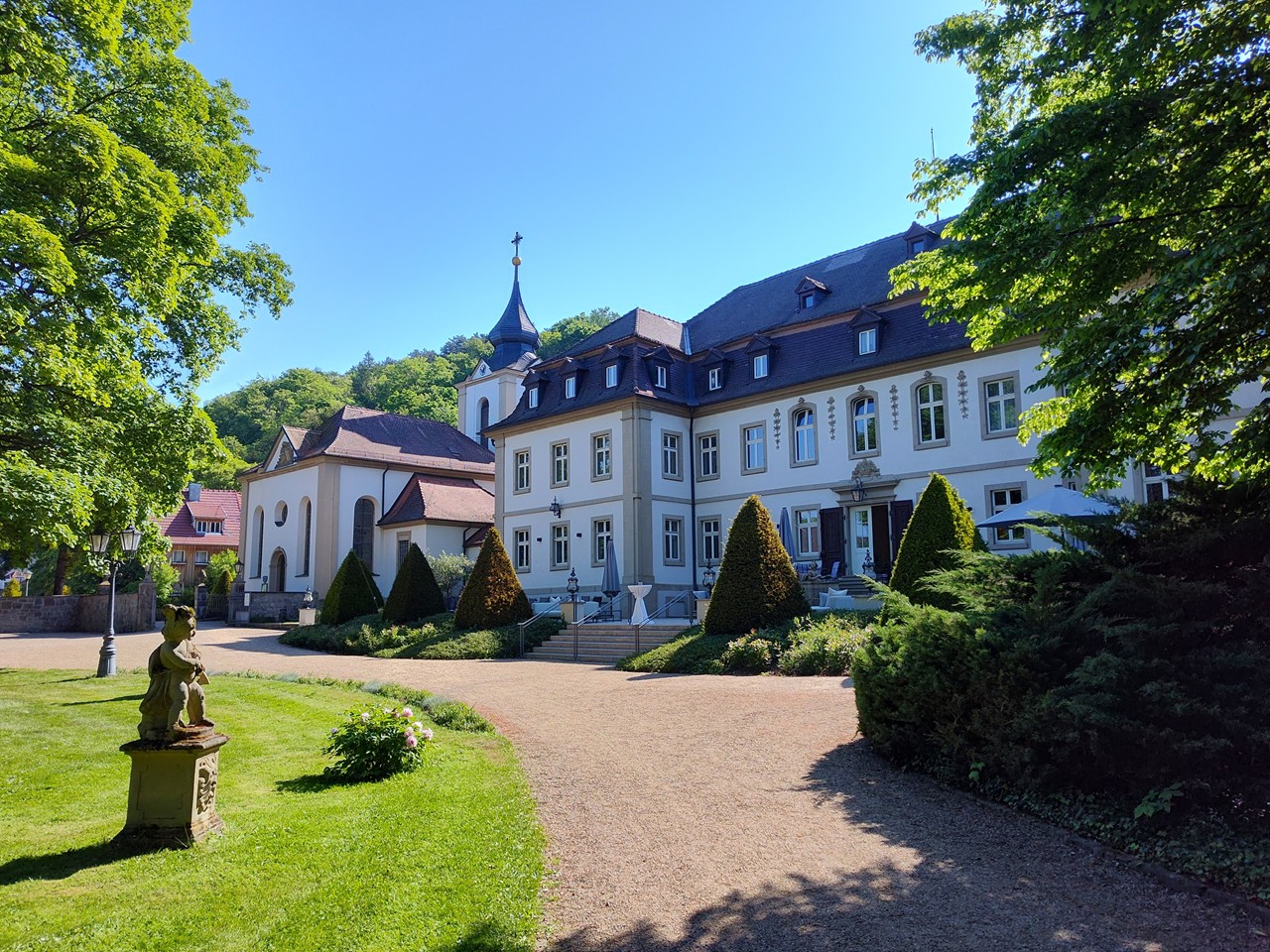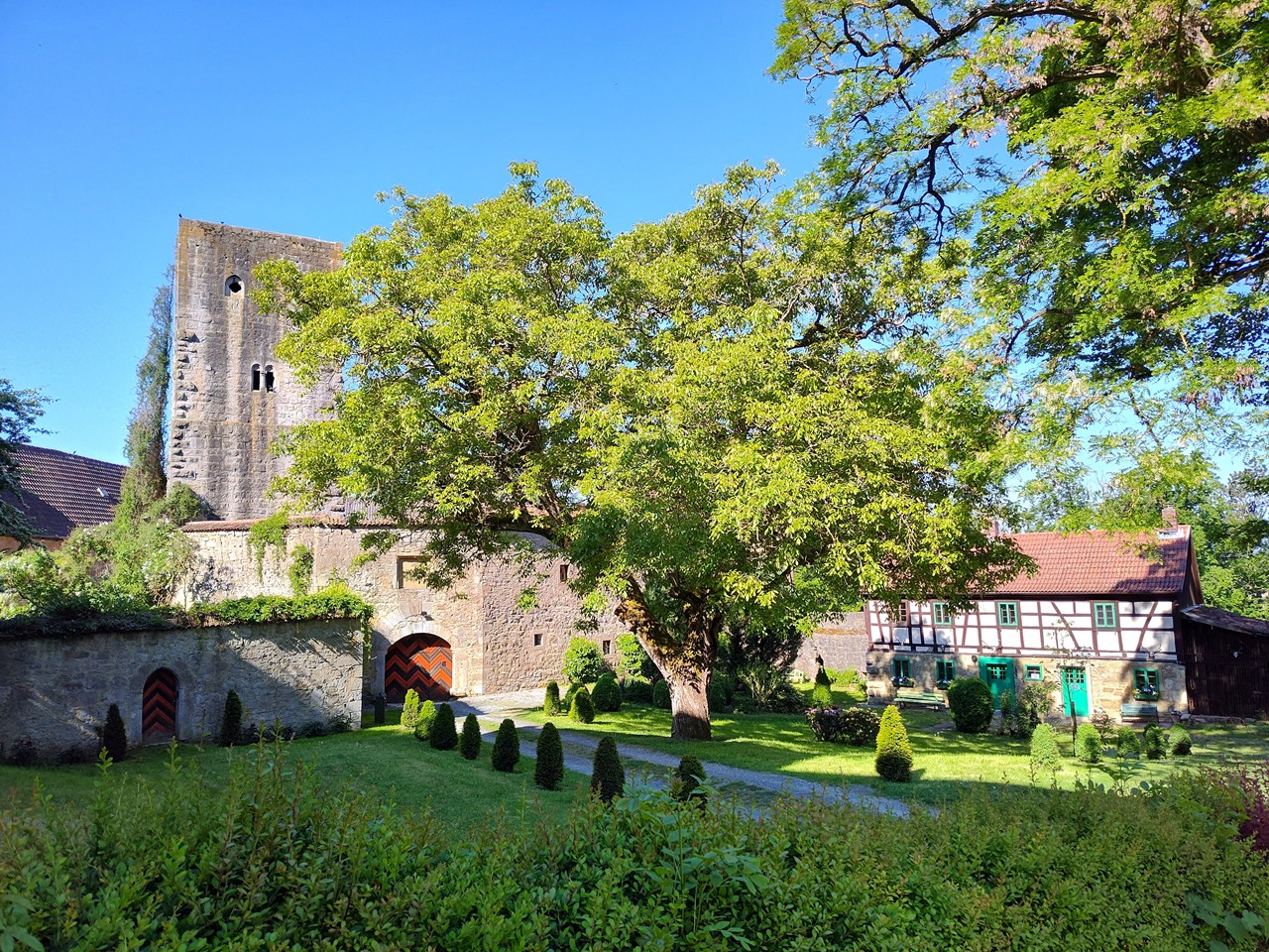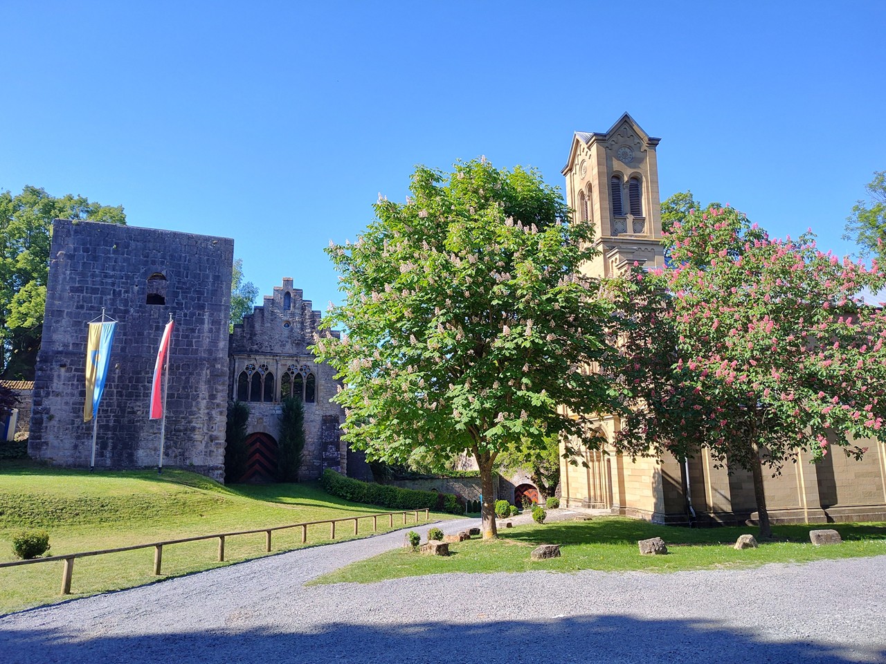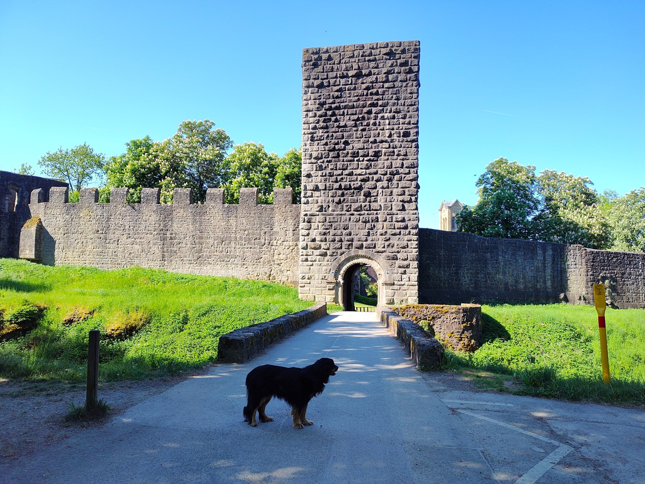 Der Kurbetrieb stützt sich auf vier Heilquellen mit einem erheblichem Gehalt an Bitter- und Glaubersalz. Es gibt einen weitläufigen Kurpark, daran angrenzend ein Park- und Schlosshotel, sowie eine Wandelhalle.Oberhalb des Ortes erhebt sich die Burg Salz, zu der ich mit Doxi am späten Vormittag hinauflaufe. Bis ins 19. Jahrhundert war der gesamte Berghang frei gerodet und diente im Hochmittelalter dem Weinbau. Von der Burg hatte man dadurch einen weiten Blick in das Saaletal und war auch von Neustadt aus gut zu sehen. Heute liegt die Burg wieder mitten im Wald.