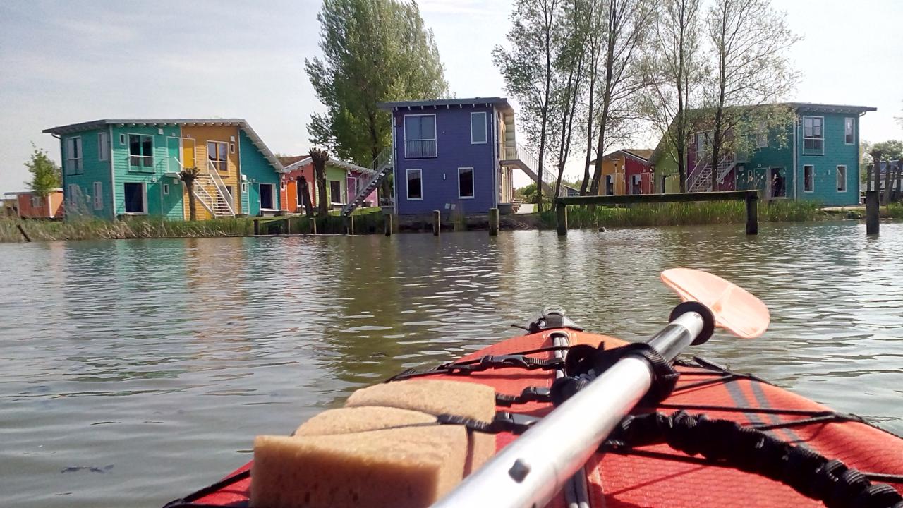 Der Campingplatz selbst liegt auf einer Halbinsel zwischen verschiedenen Wasserflächen, sodass man dort wunderbar paddeln kann. Ein interessanter Mix aus Großstadtleben und Natur.