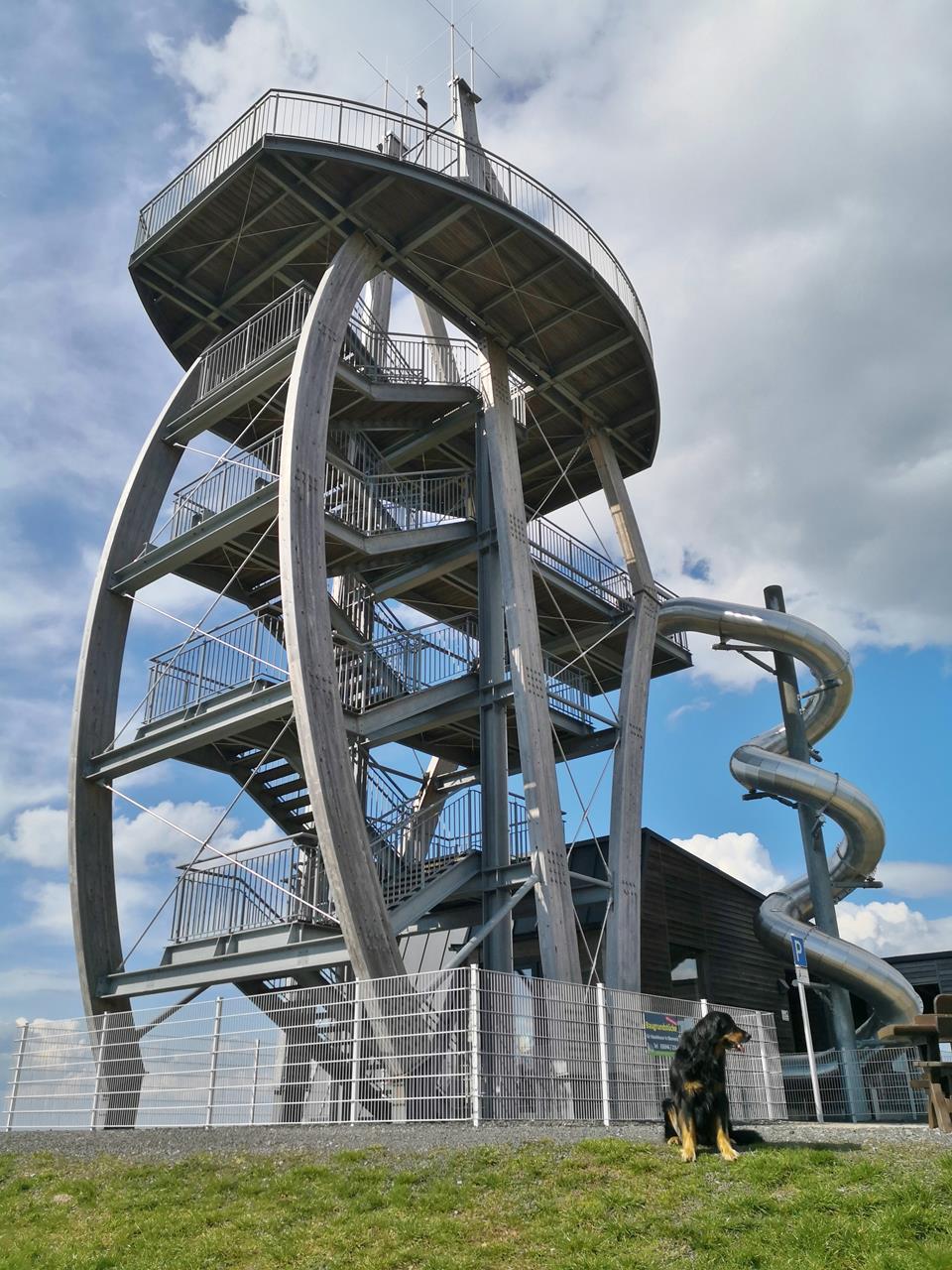 Ich stehe mit dem Womo am Ellenbogen, einem 813 m ü.N.N. hohen Berg im Landkreis Schmalkalden-Meiningen. Untere Teile seiner Flanken liegen in Bayern und Hessen.Seit 2017 gibt es hier auf dem Gipfel den Aussichtsturm „Noahs Segel“ mit Rutsche und Ausstellungsgebäude.