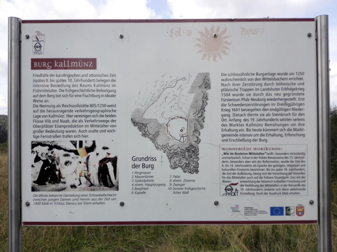 Dem Kamm des Himelsberges folgend, gelangen wir zu einem herrlichen Aussichtspunkt auf den Höhen über dem Naabtal. Von dort ist es nicht mehr weit zur Burgruine Kallmünz. Nun geht es einen steilen Weg von der Burg hinab ins Dorf und zurück zu unserem Ausgangspunkt.